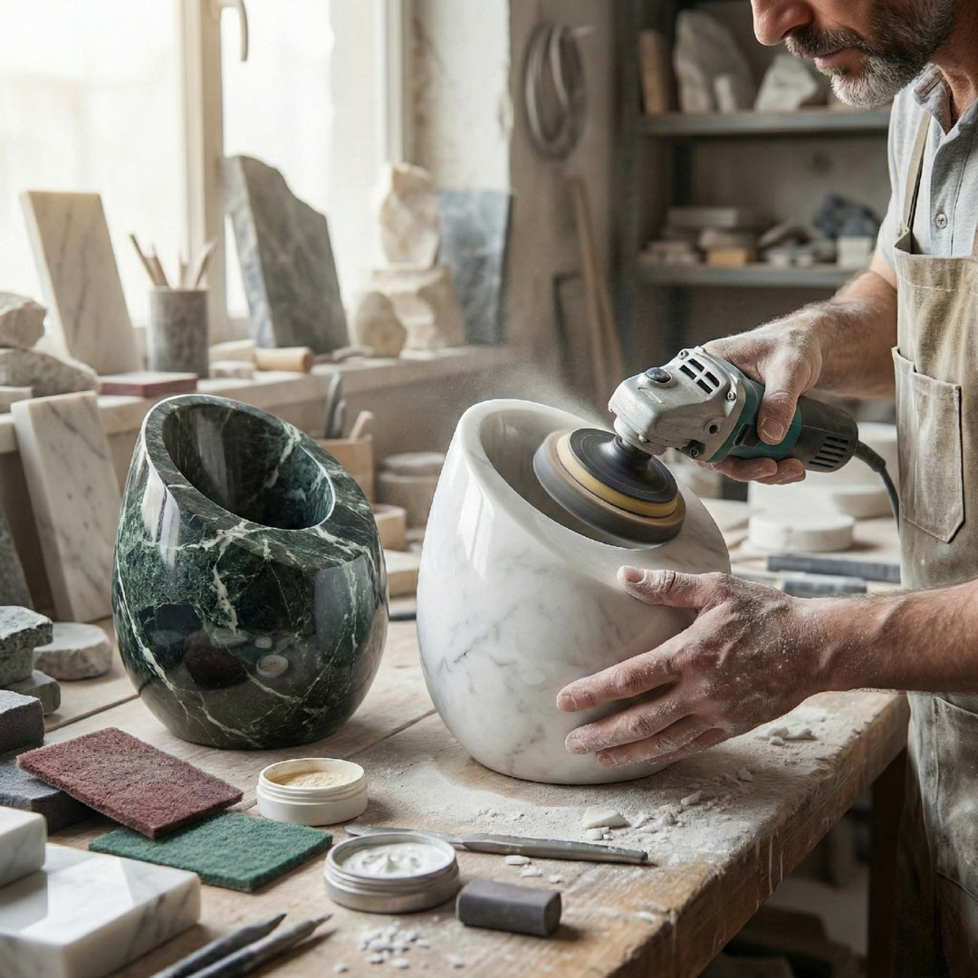Marble is a naturally dense stone, which is why we choose it for its longevity and weight. Unlike cheap cork or sandstone that can mold over time, our marble coasters are designed to catch condensation. To maintain their pristine look, simply give them a quick wipe with a soft cloth after use. This prevents "ringing" and keeps your coasters looking like the day they were hand-finished in our studio.